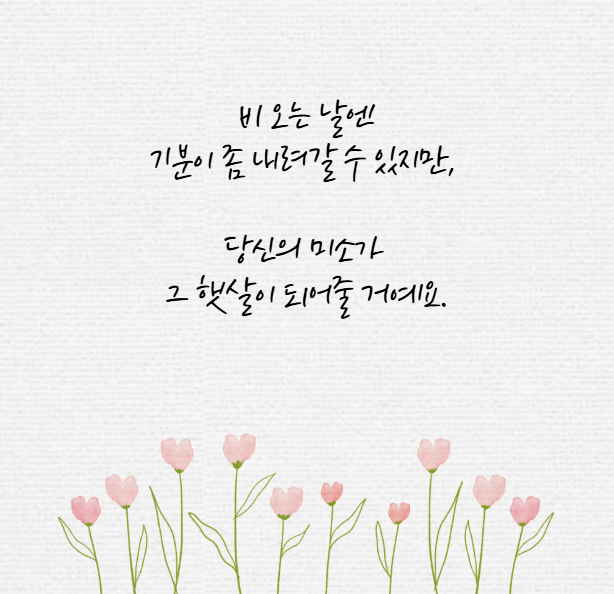 - 비 오는 날엔 기분이 좀 내려갈 수 있지만, 당신의 미소가 그 햇살이 되어줄 거예요.