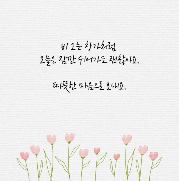 - 비 오는 창가처럼 오늘은 잠깐 쉬어가도 괜찮아요. 따뜻한 마음으로 보내요.