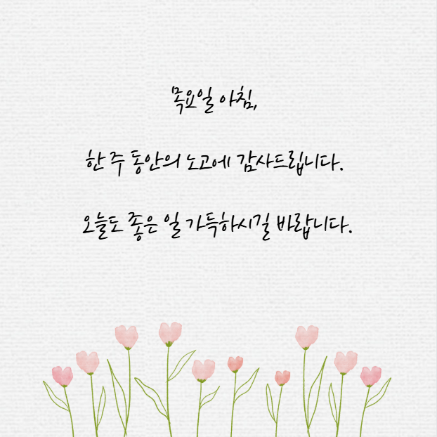 - 목요일 아침, 한 주 동안의 노고에 감사드립니다. 오늘도 좋은 일 가득하시길 바랍니다.