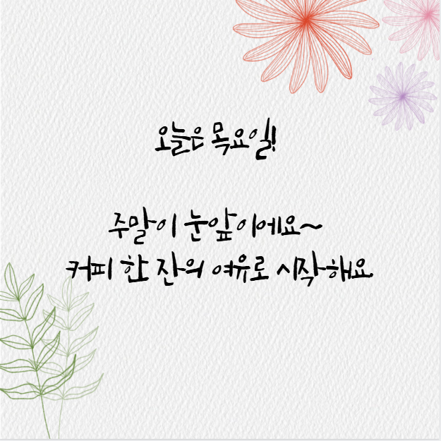 - 오늘은 목요일! 주말이 눈앞이에요 커피 한 잔의 여유로 시작해요.