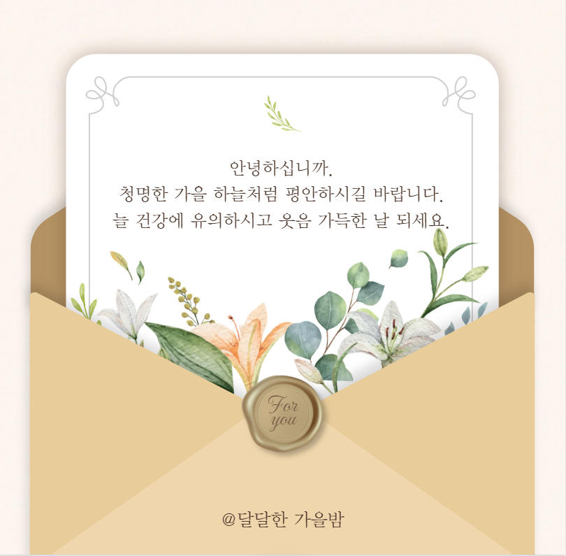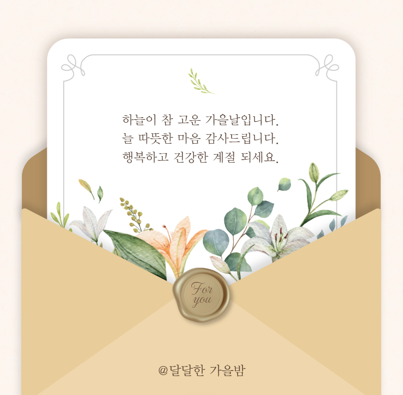 가을 햇살처럼 따뜻한 인사 전해요. 늘 건강하고 행복하길 바랍니다. 조만간 꼭 봐요.