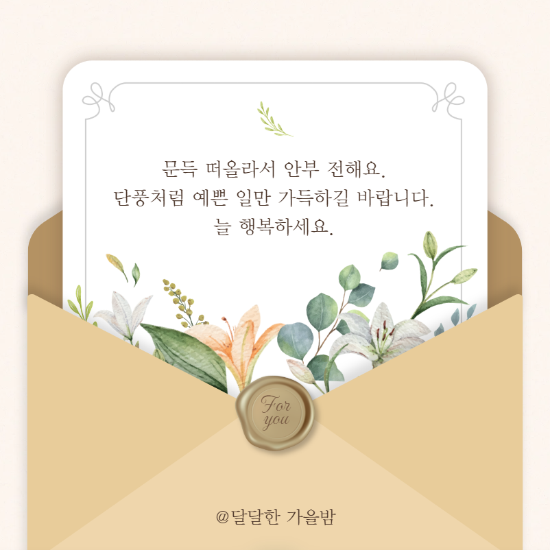 문득 떠올라서 안부 전해요. 단풍처럼 예쁜 일만 가득하길 바랍니다. 늘 행복하세요.